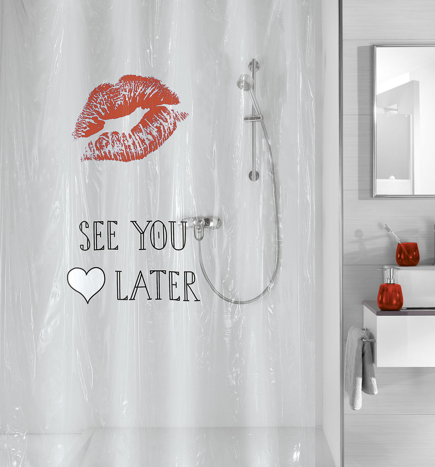 Koupelnový závěs je vyroben ze 100% PEVA. V horní části závěsu je pevný pásek s otvory na kroužky.