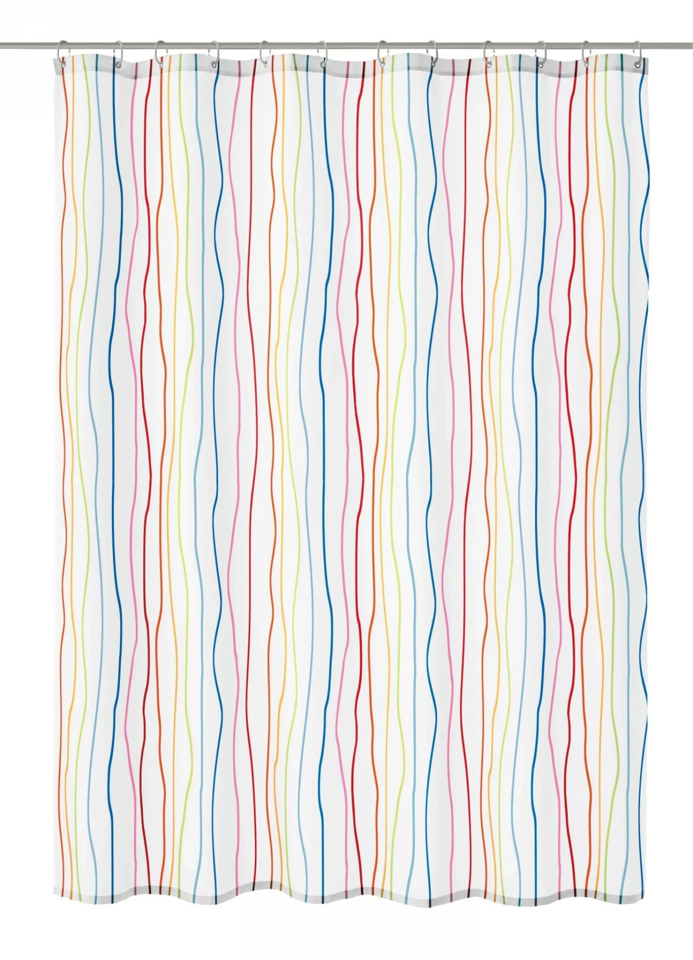 Koupelnový textilní závěs je vyroben ze 100% polyesteru. Závěs je naimpregnovaný, voda po něm krásně stéká do vany. V horní části závěsu je pevný pásek s otvory na kroužky. Aby textilní závěs byl stále napnutý, má v dolní části všitý zpevňovací proužek.