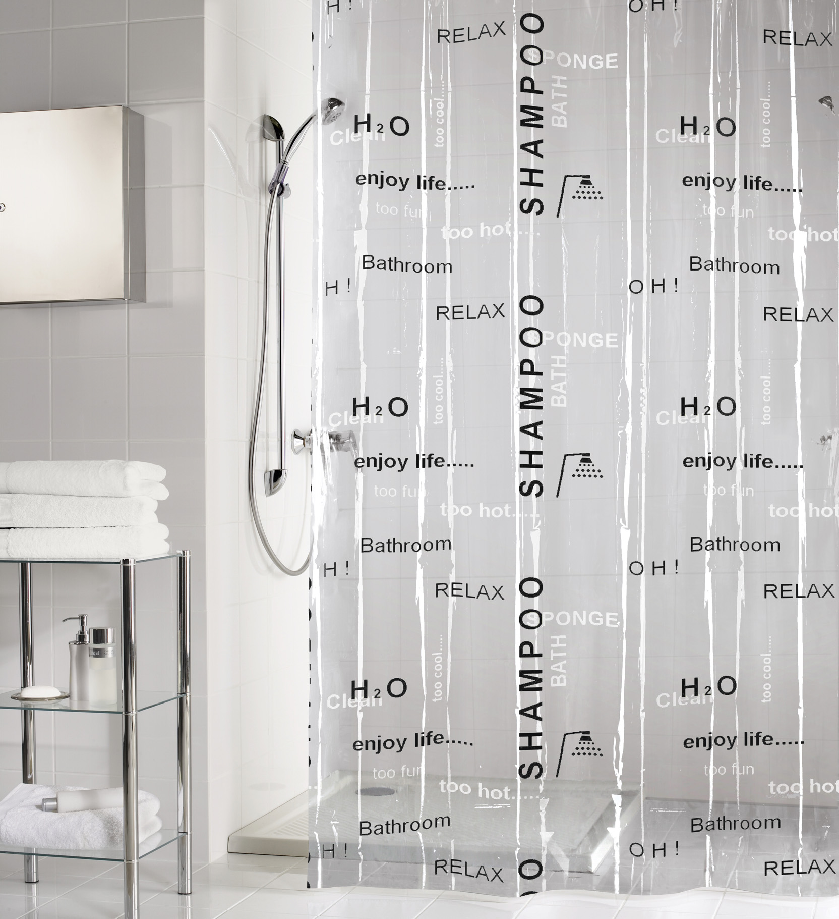 Koupelnový závěs je vyroben ze 100% VINYL, voda po něm krásně stéká do vany. V horní části závěsu je pevný pásek s otvory na kroužky.